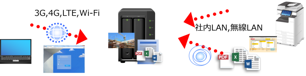複合機に送られてきたFAXデータやNASに保存されたデータの確認をアプリにて、外出先からでもリアルタイムで共有可能です。